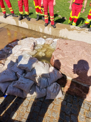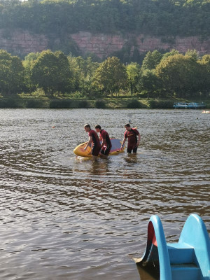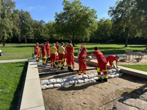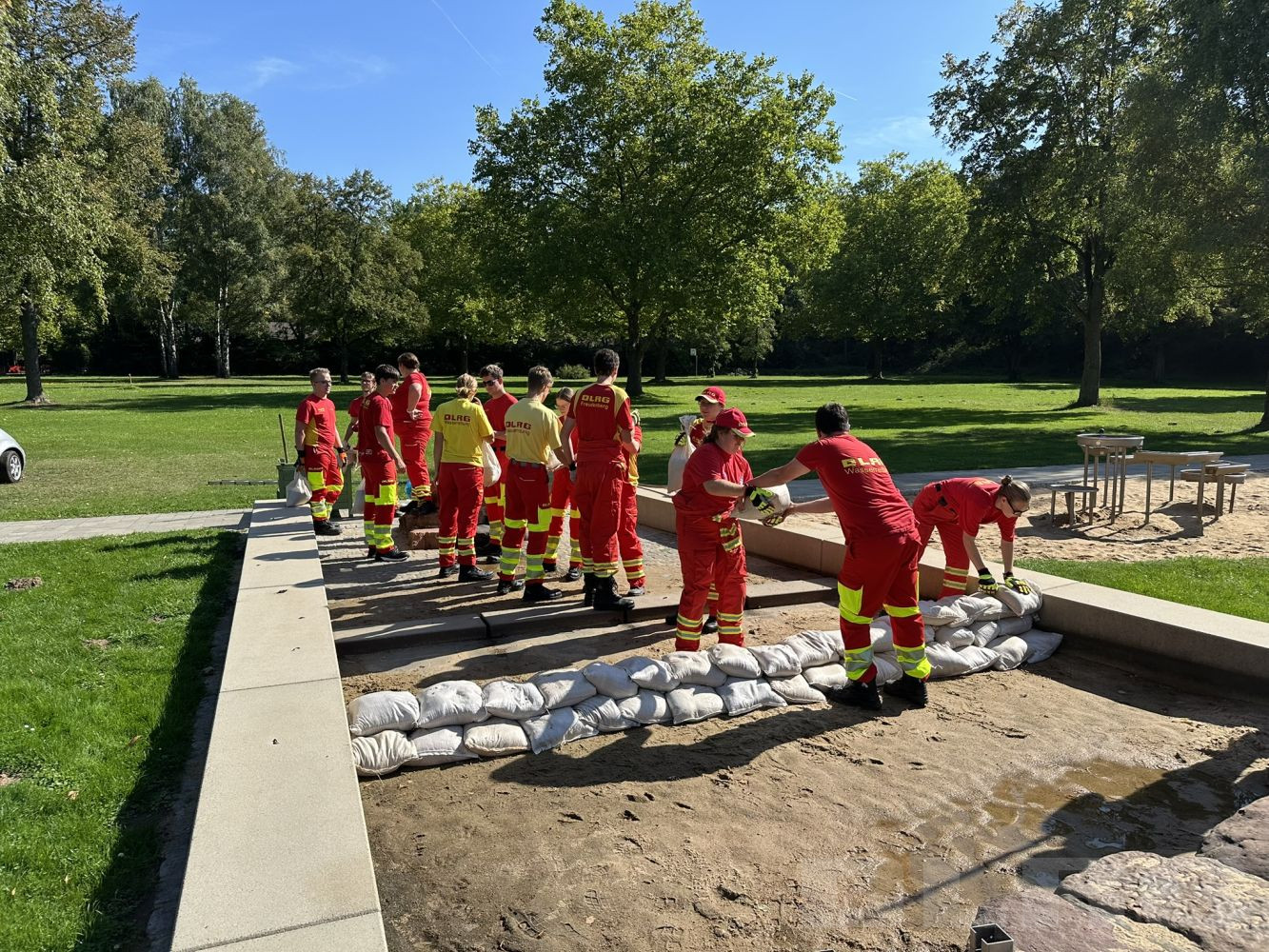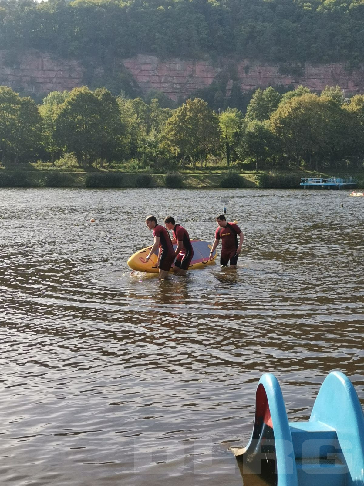 Am letzten Wochenende kamen noch einmal alle in Freudenberg am Badesee zusammen. Das Wetter war perfekt. 30°C und Sonnenschein. Neben ein wenig Theorie kam auch das praktische Üben nicht zu kurz. Im Rahmen der Einheit Hochwasserschutz wurde nach dem Füllen von Sandsäcken deren Einsatz bei der Deichverteidigung geübt. Danach ging es dann ins Wasser, wo die Rettungsbretter zum Einsatz kamen. Ziel dieser Einheit ist es eine Person, ohne deren Mitwirken sicher auf das Brett und dann ans Ufer zu bringen.